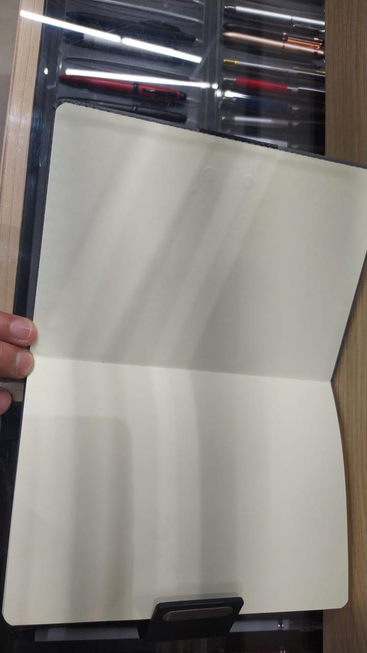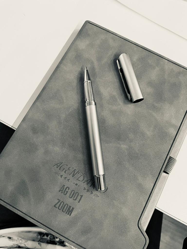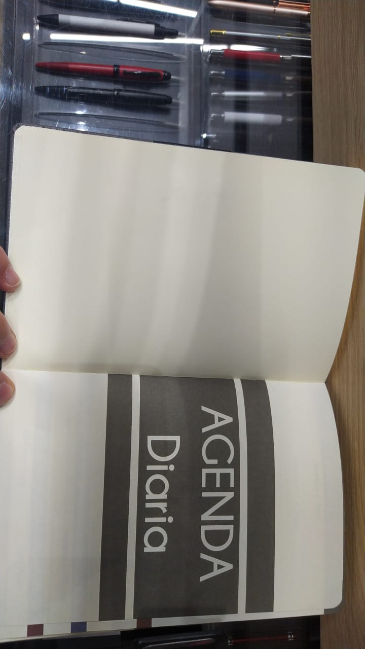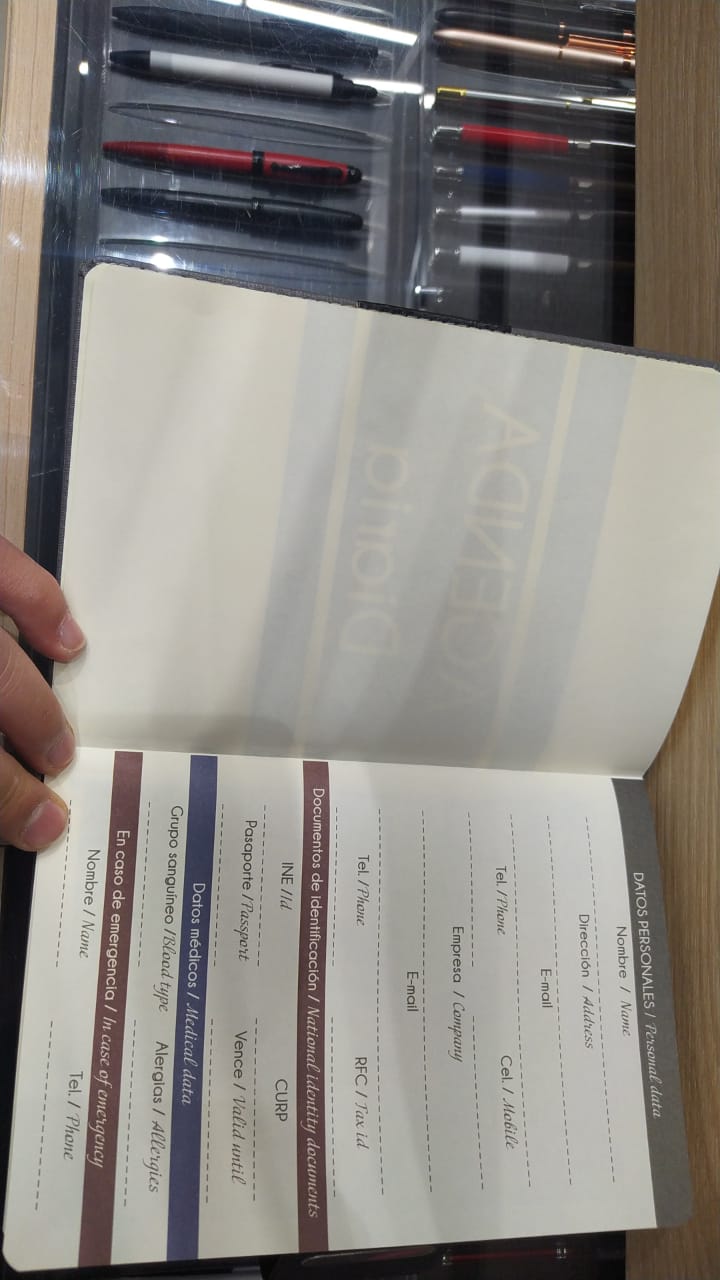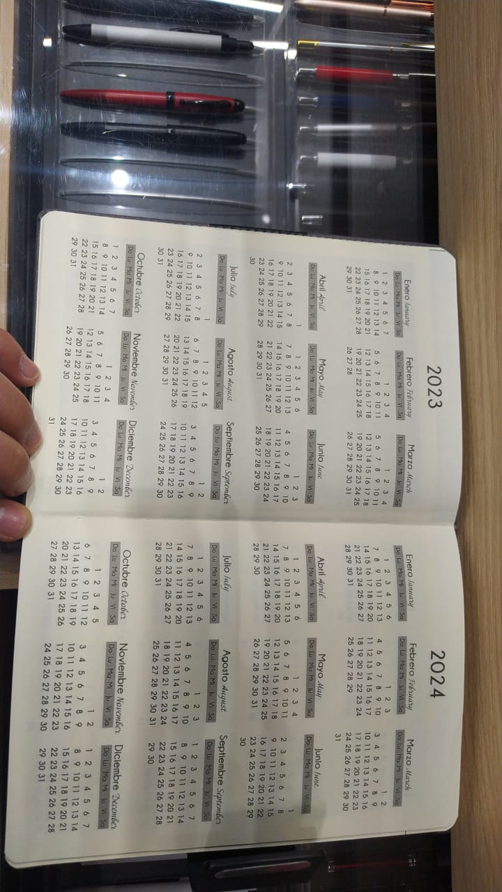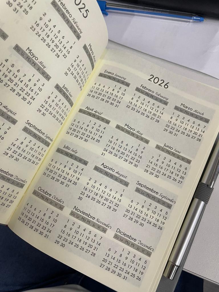 Agenda diaria con calendario de 2023 a 2026. Dentro de sus apartados contiene: datos personales, teléfonos de emergencia y festividades personales. Incluye bolígrafo.
