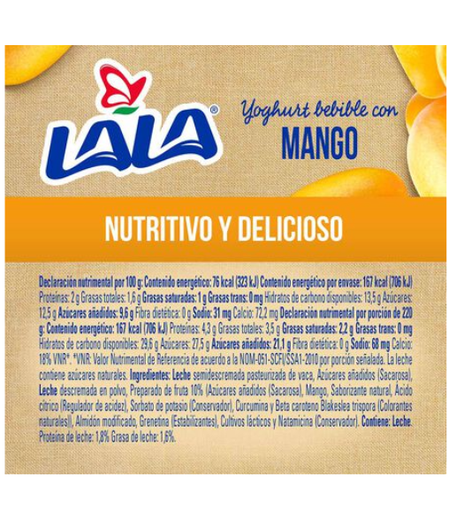 Deleita a tu paladar con un yoghurt bebible Lala, que al estar hecho con fruta natural y leche, aportará proteína a tu dieta como parte de una alimentación balanceada. ¡Dale a tu familia un rico yoghurt sabor a mango! Conoce la variedad de productos que tenemos para ti y compra en línea fácilmente.