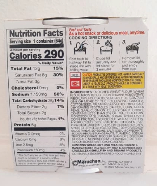 Sopa instantánea Maruchan Sabor a Pollo, lista en 3 minutos, 0% ácidos grasos trans, adicionado con hierro y ácido fólico.