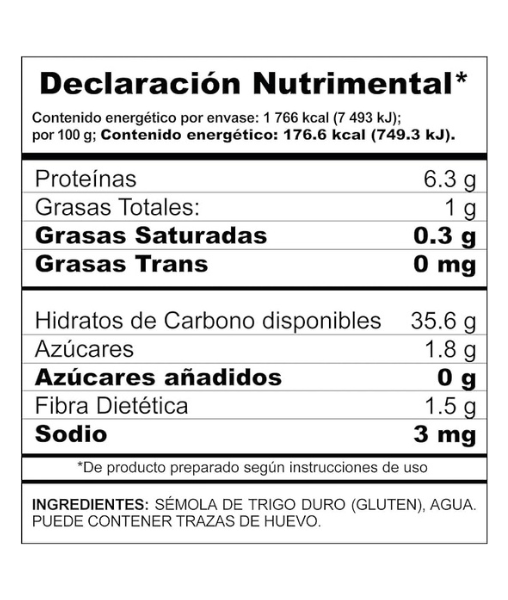 Sémola de trigo duro restituida y adicionada de acuerdo con la NOM-247-SSA1--2008. Contiene gluten.