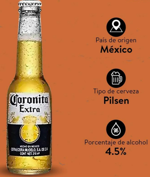 Corona Extra es una Cerveza Pilsner de color amarillo pajizo con tonalidades doradas y suaves notas a cereales. Contiene 4.5% grados de alcohol, un sabor ligero de alta frescura y una perfecta densidad en su espuma.