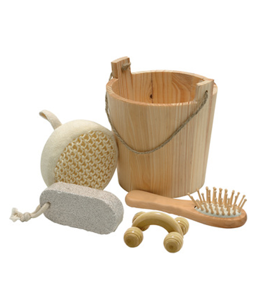 Set con cubeta de madera, esponja, piedra/lima, masajeador y cepillo pequeño de cabello.